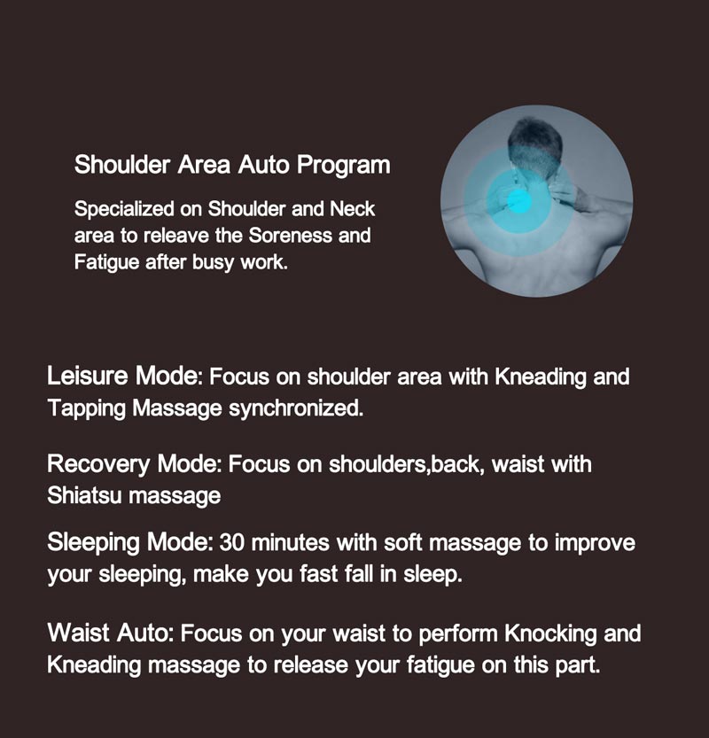 5.六种手法各异的自动按摩模式,特别增加颈间重点和腰背重点两种自动按摩程序,更加人性智能化。